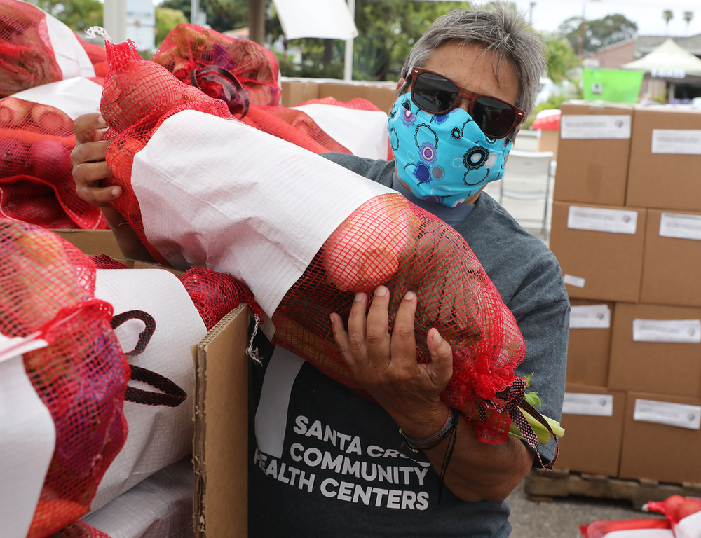 [Staff from Santa Cruz Community Health Centers distributing food in partnership with Second Harvest Food Bank, photo shot by Schmuel Thayer]